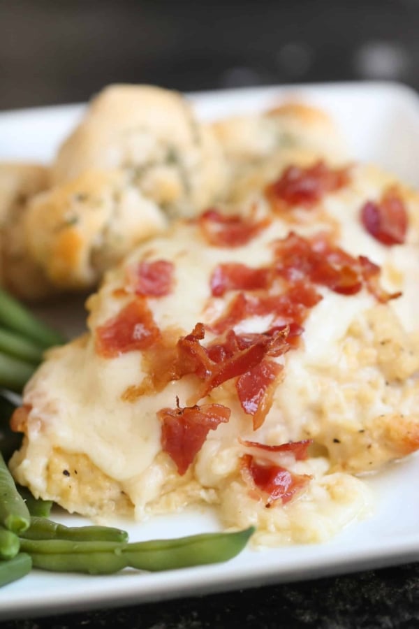 We love this delicious chicken recipe. There is nothing better than chicken topped with cheesy goodness and bacon crumbles. Your family will definitely be adding this to the regular meal rotation.
