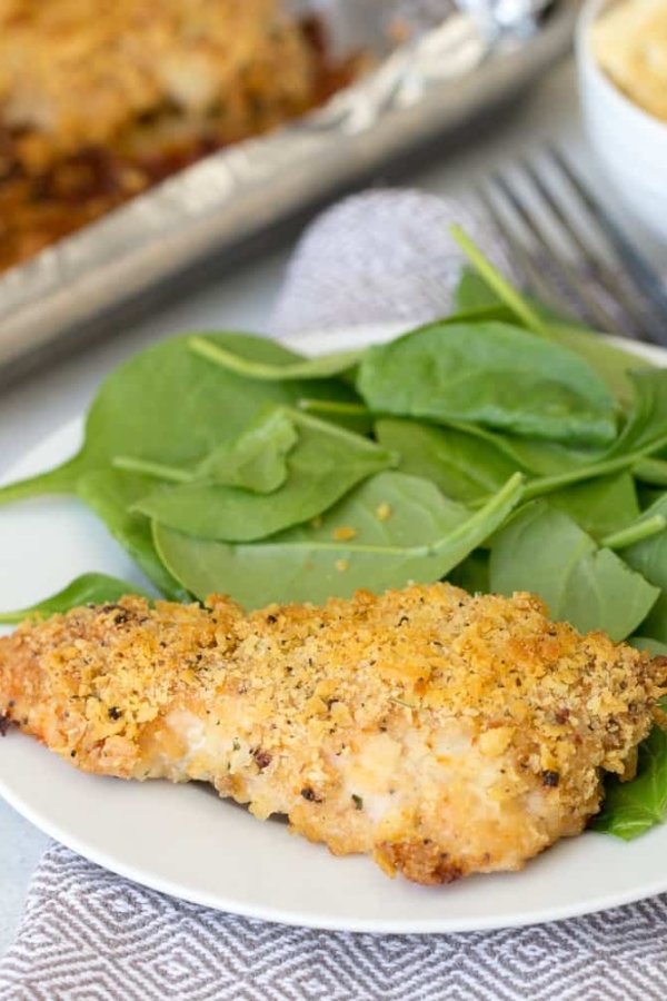 This Cheddar Baked Chicken is coated in a cheesy, buttery, crumb and Corn Flake breading and baked to perfection. This easy baked chicken comes out perfectly tender every time.