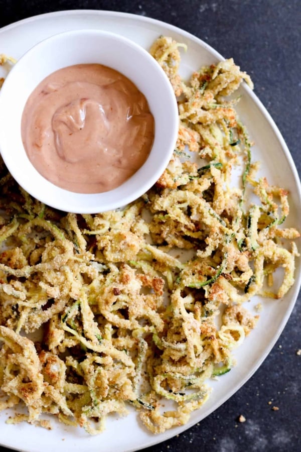 Zucchini that’s spiralized, breaded, and baked to crispy perfection. Toss it with some parmesan cheese, and you’ll never eat zucchini another way again.