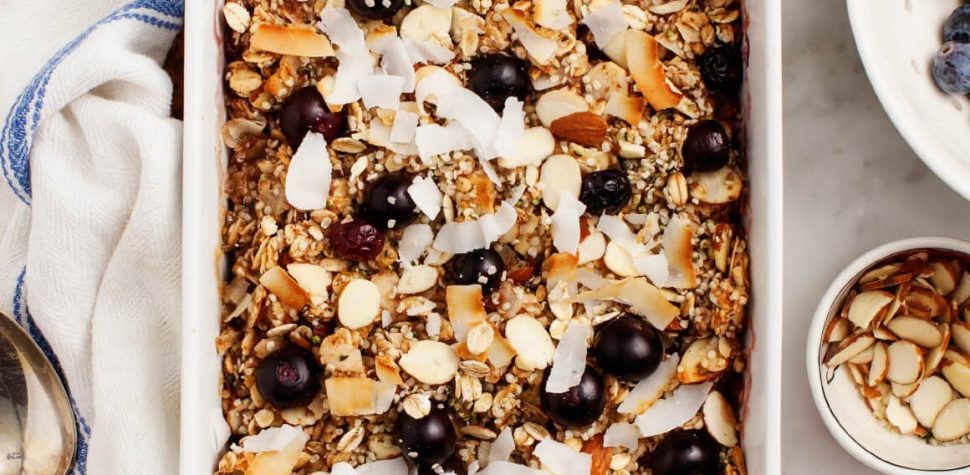 - Layer the bananas and strawberries in the baking dish and spread the oat mixture on top. Sprinkle with the blueberries and the reserved almonds, hemp seeds and coconut flakes.