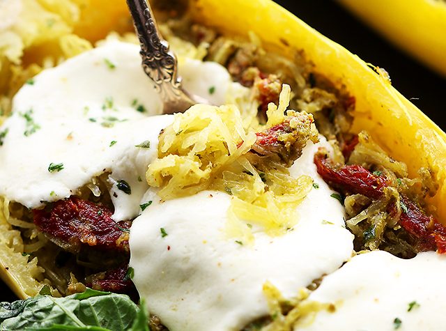 Basil Pesto Spaghetti Squash Pasta – An easy and healthy spaghetti squash pasta dinner tossed with basil pesto and sun dried tomatoes.