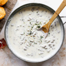 Homemade sausage gravy is easy to whip up and so good over warm biscuits. You can also serve the gravy over fried chicken, breakfast potatoes, mashed potatoes, English muffins, or toast.