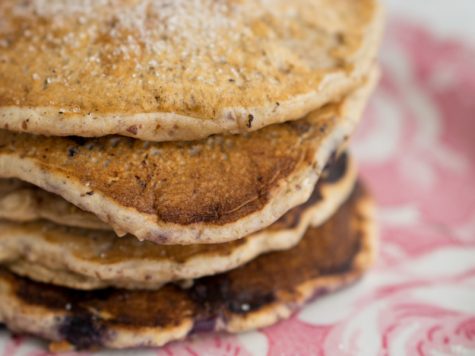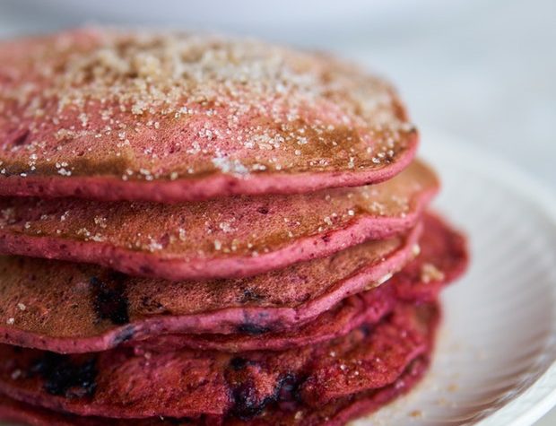 This recipe is a riff on my favorite vegan oatmeal pancakes, they’re accented with blueberries, and boosted with beet juice. The beet juice is what makes the pancakes the beautiful pink color you see. These pancakes are hearty, substantial, delicious, and kid-friendly. especially when you dust them with cinnamon-sugar straight out of the pan, churro style.