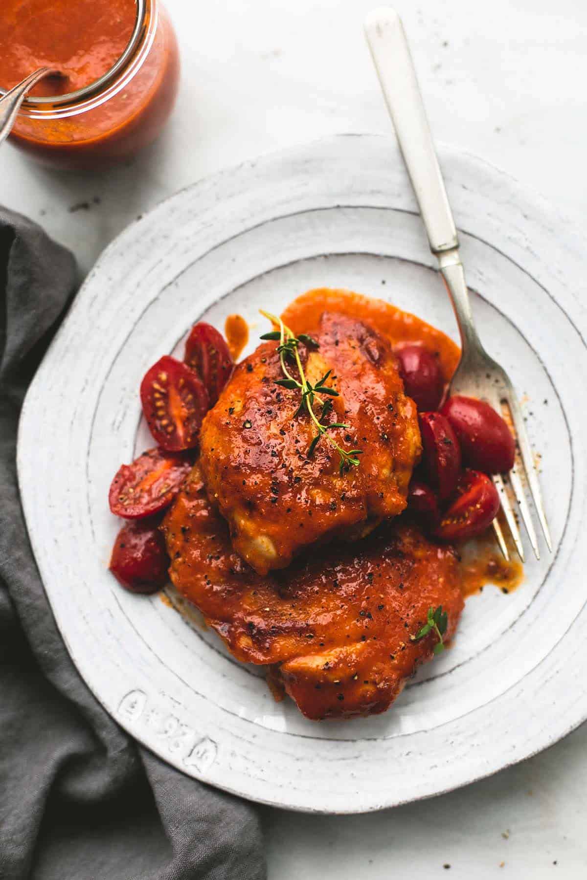 - Drizzle reserved sauce over chicken and tomatoes and cook 1-2 minutes longer until heated through. Garnish with black pepper and fresh thyme if desired and serve alone or over steamed white rice.