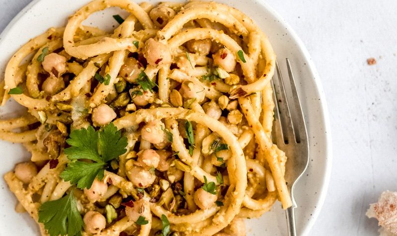 Brown Butter Pistachio Pesto Pasta with Chickpeas