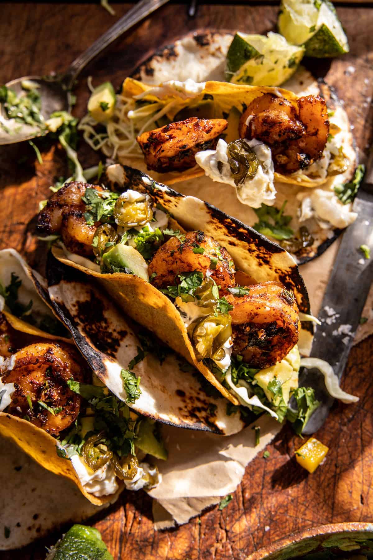 Sheet Pan Spicy Shrimp Tacos with Jalapeño Lime Crema.