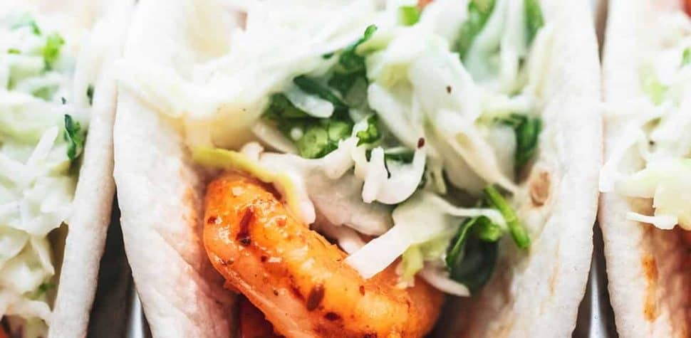 Sheet Pan Spicy Shrimp Tacos with Jalapeño Lime Crema.