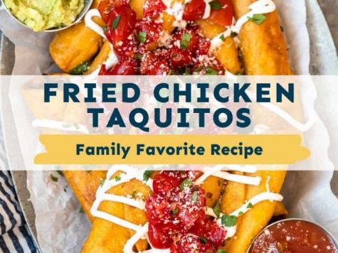 Crispy Cheese Chicken Tacos with Avocado Cilantro Sauce.
