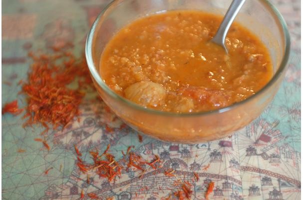 Ingredients: 4 tablespoons oil,1 large Spanish onion, diced,1 medium carrot, diced,1 celery stick, diced,1 gram 120 (4 oz) mild chorizo cut into cm cubes,1 gram 120 (4 oz) mild chorizo cut into cm cubes,2 garlic cloves, thinly sliced,1 teaspoon ground cumin,1 1/2 teaspoons chopped fresh thyme leaves (I use 1 teaspoon of dried sometimes),2 smalls dried red chillies, crushed (I omit these because of the kids),1 can of chopped tomatoes (or 2 roughly chopped fresh tomatoes),500 grams (about a pound) cooked, peeled chestnuts (although you can get them fresh here, I usually use vacuum packed because I detest pee,4 tablespoons 20 saffron threads infused in 3- boiling water,1 liter (about 2 cups) of water,sea salt and pepper to taste