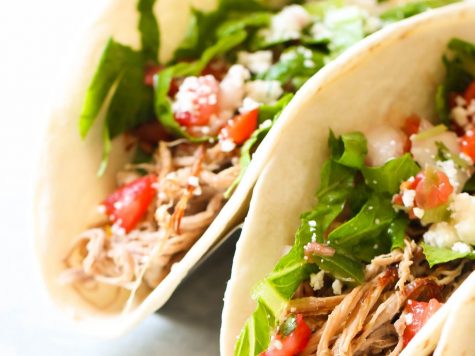 Crockpot Crispy Chicken Tinga Tacos with Avocado Jalapeño Crema