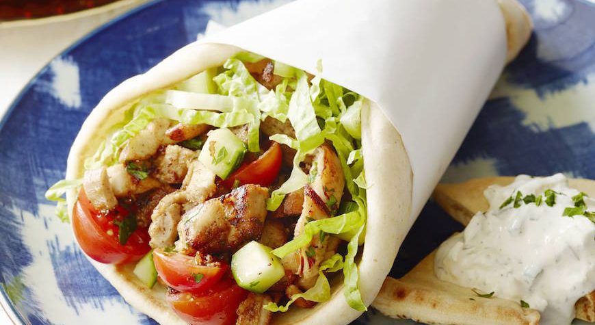 - Place the chicken in the middle of a pita and top with the assorted toppings. Fold the pita up and wrap with parchment to hold it together.