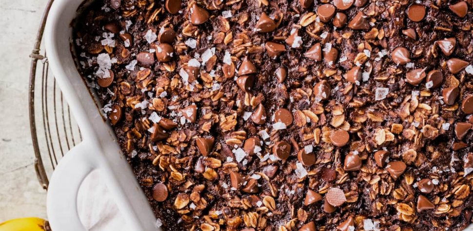 Chocolate Banana Baked Oatmeal- If you like my Chocolate Banana Bread, you will love this easy baked oatmeal too! It tastes just like my famous banana bread. Make a pan and enjoy all week! It’s great for breakfast, a snack, or even dessert!