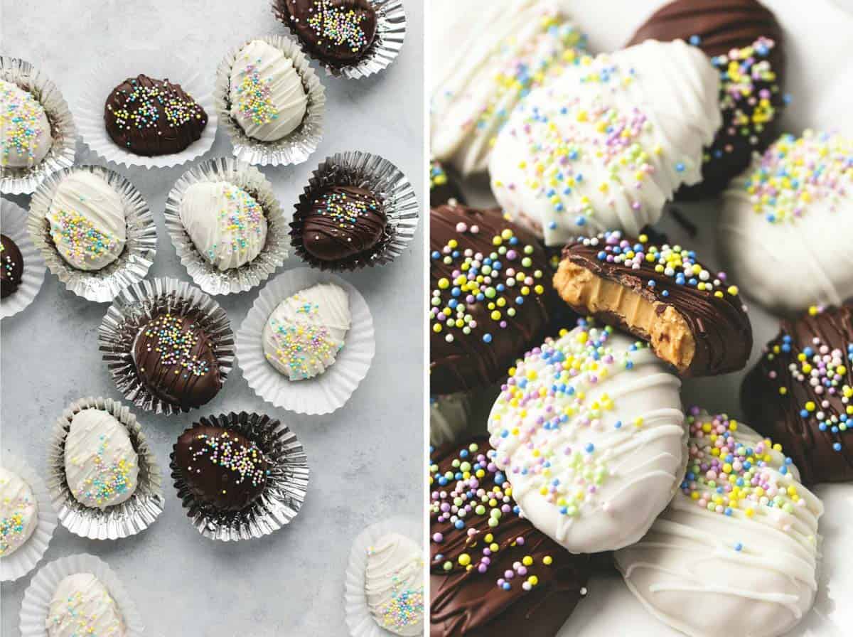 - Remove peanut butter eggs from fridge or freezer and use a fork to dip them one at a time into the melted chocolate – tap the fork on the side of the bowl after each dip to drain excess chocolate – then transfer back to baking sheet. Drizzle with a bit of extra chocolate and top with sprinkles if desired. Repeat with remaining peanut butter eggs. Allow to cool for a few minutes (you can transfer back to fridge or freezer for a minute or so and they will harden very quickly) and serve or store at room temperature.
