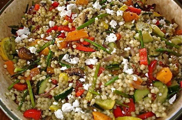 Ingredients: 2 cups of Israeli pearl couscous or regular couscous,3 cups of boiling hot chicken stock (2 cups for regular,6 tablespoons of extra-virgin olive oil,1/2 cup sun-dried tomatoes chopped,3 tablespoons bought basil pesto,3 tablespoons balsamic vinegar,pinch of salt and pepper to taste,1 cup crumbled feta cheese,2 mediums sized zucchinis, sliced,2 mediums to 3 sized yellow squashes, sliced,1 red pepper, seeded and cut into pieces,8 brown mushrooms, sliced,4 garlic cloves minced,2 cups of butternut cut into cubes,1/2 cup of red onions cut into pieces,2 cups of asparagus cut into pieces,extra-virgin olive oil,balsamic vinegar