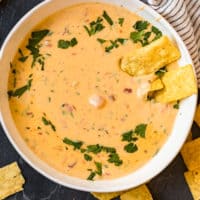 You can serve queso alongside salsa, sour cream and chips. You can even serve this queso alongside your favorite meals as a sauce. It’s also delicious served with Potato Wedges . Or you can spoon it over tacos or fajitas or grilled chicken.