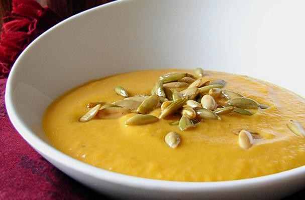 - Add the chicken stock and dry white wine and simmer 20 to 30 minutes. Pure soup in food processor until smooth. Return to saucepan and add cream, salt, and pepper.Ladle soup into warmed serving bowls and garnish with toasted pepitas, caramelized shallots or garlic croutons.