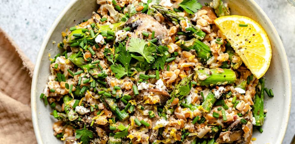 Farro with mushrooms, asparagus, creamy goat cheese, fresh herbs, and a touch of lemon makes a great side dish to any meal. You can also enjoy this hearty vegetarian dish for lunch or dinner.