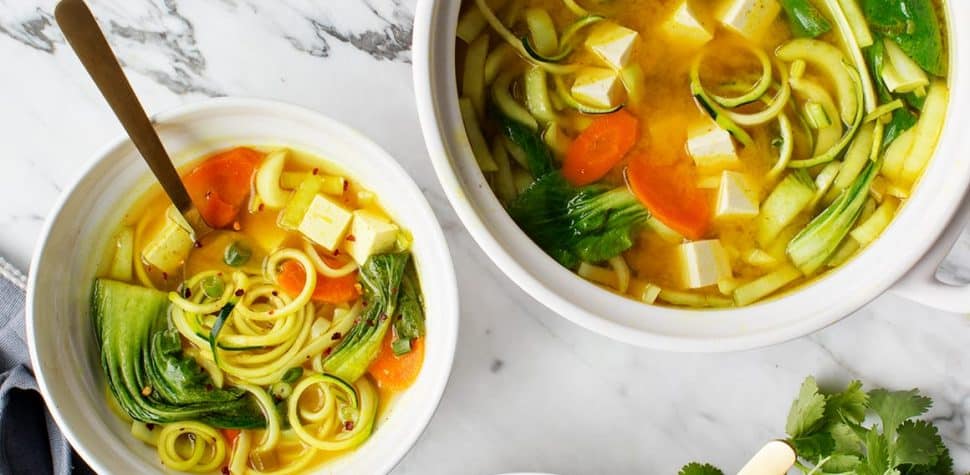 - Scoop ½ cup of the hot broth into a small bowl with the miso paste. Stir until combined and return it to the soup pot. Add the turmeric, black pepper, lemon and lime juice, coconut oil, tamari, sriracha, tofu, noodles, and bok choy. Simmer for 10 minutes. Season to taste with ¼ teaspoon sea salt, if desired, and serve with fresh herbs, if desired.