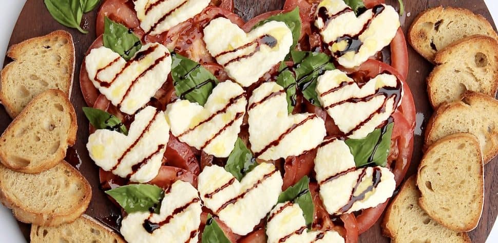 Everyone loves caprese salad, so what better way to serve it than in a heart shape?! A beautiful treat that’s not sweet. It comes together so quickly and so easily that you’ll want to shape your caprese salad into a heart every time you make it from now on.