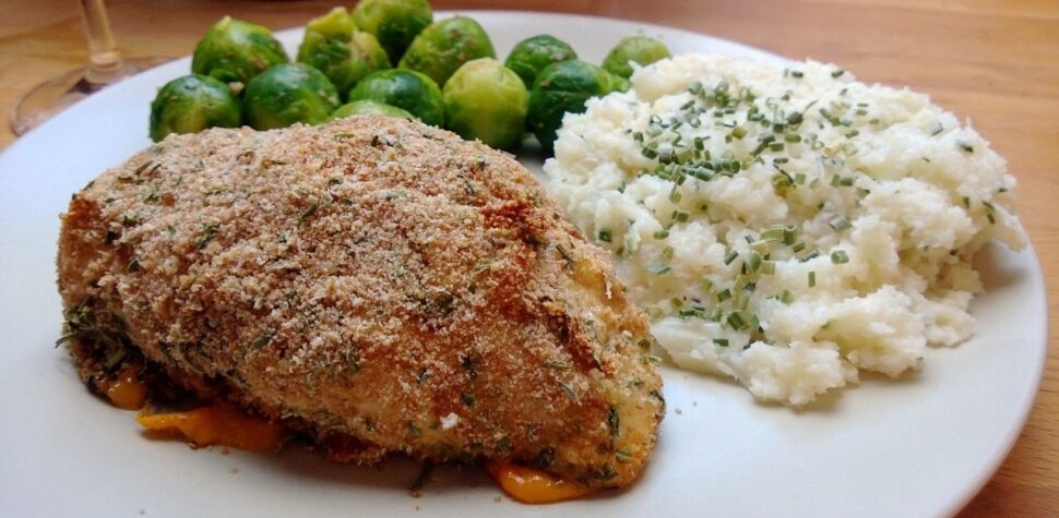 Ingredients: 1/2 cup breadcrumbs,2 slices of cheddar cheese,2 chicken breasts,2 slices of deli ham,2 tablespoons dried marjoram,2 tablespoons dried parsley,1 tablespoon dried rosemary,1 egg,1/2 cup flour,salt and pepper
