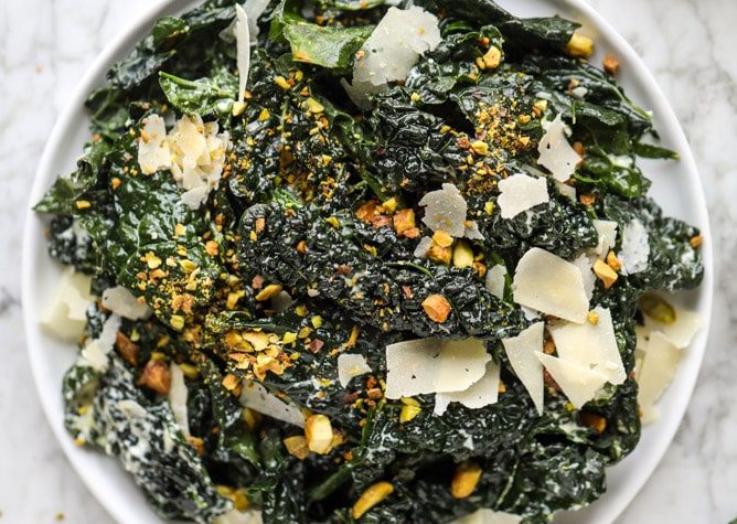 Drizzle a few tablespoons of the dressing over the kale and toss it well. I like to toss this for a food 1 to 2 minutes so the dressing is evenly dispersed. Cover with the chopped pistachios and shaved parmesan. Serve!