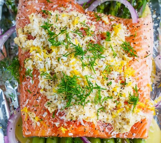 - Mix the butter, miso, garlic, lemon juice and zest, dill, parmesan, and pepper and spread it across the top of the salmon before wrapping the parchment paper or aluminum foil up to seal the packets.
