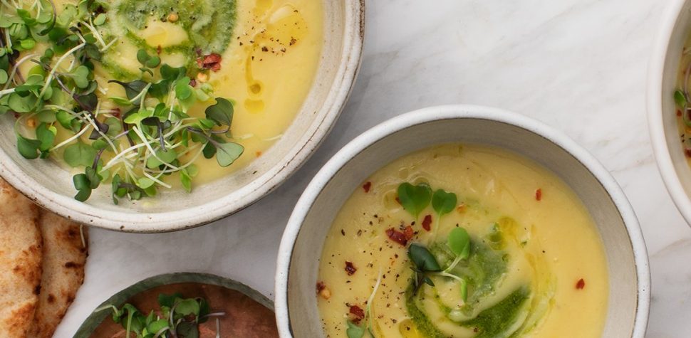- Scoop into bowls and serve with swirls of the Creamy Kale Pepita Pesto.* Top with the microgreens and red pepper flakes, if desired. Serve with naan bread.