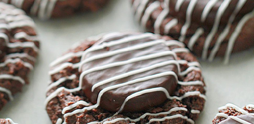 - Take sheet out of oven and while the cookies are still very hot, place a thin mint patty on top center of each cookie. Let cookies cool, then melt chocolate chips in microwave at 30-second intervals and drizzle melted chocolate on top of the cookies. Once cooled serve them on a cookie tray.