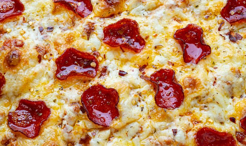 - Sprinkle the pizza sauce over the cheese, followed by the remaining cheese and the pepperoni (or your favourite pizza toppings).