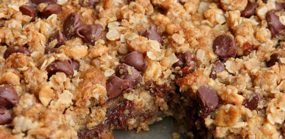 Serve and enjoy! Your crew will devour these treats before you can say, “Peanut Butter Oatmeal Chocolate Chip Banana Bread Bars with a Peanut Butter Oat Streusel!”