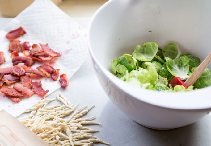 Trofie Pasta can be found at European import markets or could be subbed for another pasta. If using another pasta I recommend a bronze dye-cut pasta (find this on the label) which absorb the flavors of the sauce more. For the Brussels Sprouts, I pull off as many of the leaves from the outside as I can and then roast those leaves in the oven until they’re crispy (creating a crispy little leaf chip). What’s leftover of the Brussels I cut in half and then sauté in some of the bacon grease after cooking the bacon. The result of the two is full flavored mini sprouts along with crispy brussels sprout chips (think kale chips but smaller!). Serve the hot pasta topped with all of the Brussels and the crispy bacon.