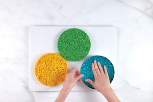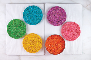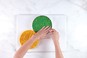 Remove the cake ring from the yellow treat (leave the treat itself in the freezer), and recoat it with cooking spray. Pour the green mixture into the cake ring and press to flatten until the mixture begins to firm up. Place the green treat with the cake ring in the freezer while you repeat steps 2–6 to make the turquoise F batch recipe.