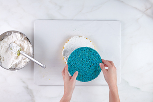 Add the cereal and mix well, until the marshmallows and cereal are fully combined, about 40 seconds. Do not overmix! Once done, pour the mixture into the cake ring. Generously coat your hands with cooking spray. Press to flatten until the mixture begins to firm up. Place the treat with the cake ring in the freezer while you repeat steps 2–6 to make the green F batch recipe. (Note: Each layer should stay in the freezer for at least 10 minutes.)