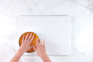 Determine the order in which you’d like the six treats to be stacked. Using the spatula, spread buttercream frosting over the top of the bottom layer, making sure to reach the edges.