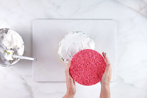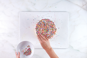 In a bowl, use your hands to mix together the different varieties of sprinkles, then sprinkle them over the frosting.