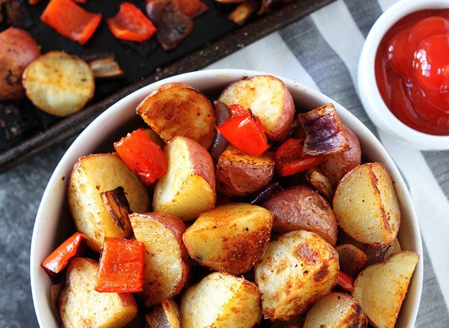 The roasted red peppers and onions give the potatoes a ton of flavor. We like to serve the potatoes hot with ketchup. You can also spice them up with your favorite hot sauce or salsa. They go great with any breakfast…and sometimes we make them for dinner. They are SO good!