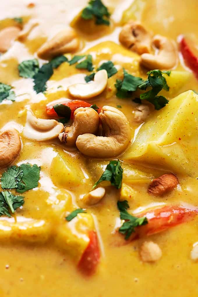 Saucy coconut curry chicken with sweet red peppers, tender potatoes, and crunchy cashews made right in your slow cooker!