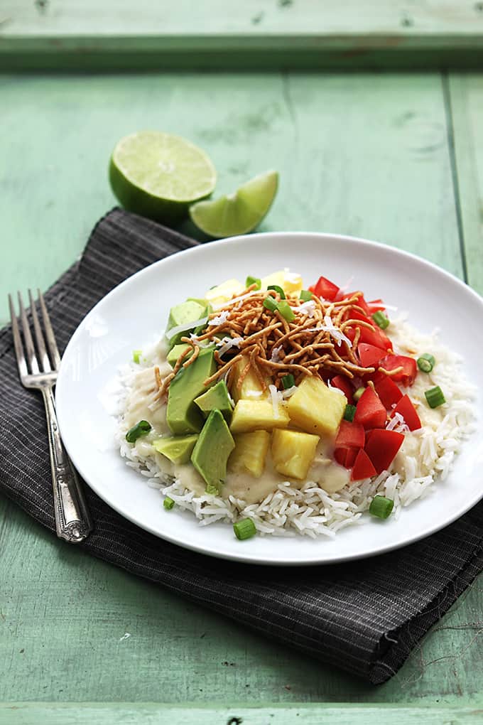 I still remember the first time I ever had Hawaiian haystacks. When I was probably 10 years old, my parents dragged me along to a wedding reception. The wedding was for some family friends who are Polynesian. Most of the wedding receptions I’ve been to have just served desserts or appetizers, mine included, but I’ll tell ya, Polynesians sure know how to do it. They served Hawaiian haystacks for dinner to all of the guests with every possible topping you can imagine. Those haystacks were pork, so they were a little bit different than the recipe I’m sharing today, but the idea is still the same with chicken.