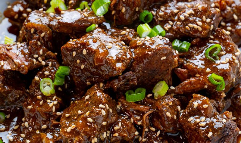 - Place the beef in the slow cooker, mix the remaining ingredients, except the sesame oi, seeds and green onions, and cook on low for 8+ hours or on high for 4-6 hours.