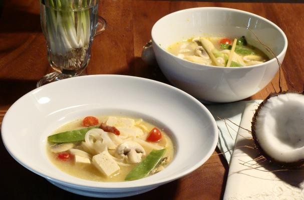 Ingredients: 2-3 stalks fresh lemongrass,3-4 dried red peppers,1 inch ginger sliced,2 cloves garlic sliced (optional),3 cups vegetable broth,1/2 cup fresh coconut milk if you can find it,6 oz tofu cubes,handful of snow peas,handful of mushrooms sliced,rice noodles about (4oz),juice of half a lime or more,grated ginger, scallions, lime slices for garnish