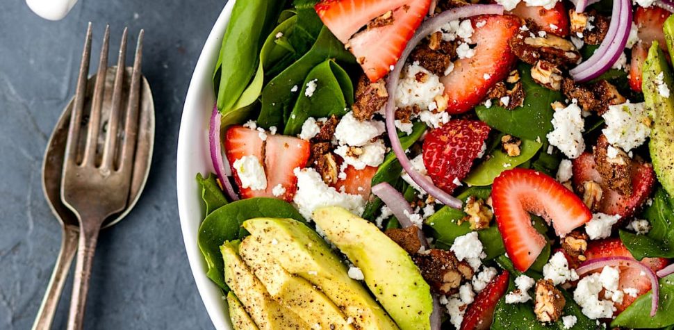 Strawberry Spinach Salad with Strawberry Balsamic Dressing – spinach salad with fresh strawberries, avocado, candied pecans, red onion, feta cheese, and a simple strawberry dressing. The perfect salad for spring and summer!