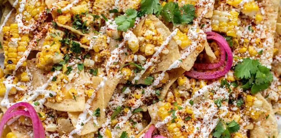 These sheet pan street corn nachos are ridiculously easy and delicious! Grilled corn, chili, lime, tons of cheese and all the flavor you could dream of!