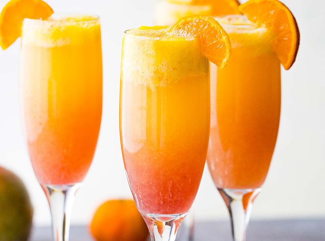 Sunrise Mimosa Recipe – A gorgeous and delicious twist to the classic mimosas prepared with mangos, orange juice, prosecco, and liqueur.