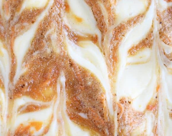 You can replace half of the oil with applesauce with good results. Full fat cream cheese works better than light cream cheese in this recipe (light cream cheese is runnier and doesn’t produce as sturdy of a cream cheese swirl/layer). Take care not to over mix either the carrot cake or cheesecake batter.