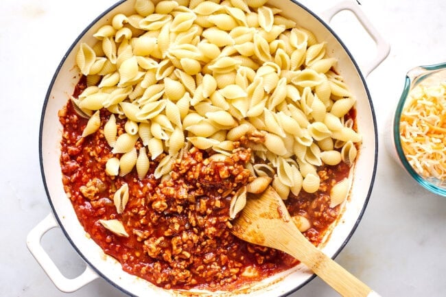 Cheesy pasta shells with a hearty taco meat sauce and lots of delicious toppings! Two of the best meals come together to create ONE incredible meal that takes less than 30 minutes to make! The perfect dinner for busy weeknights!