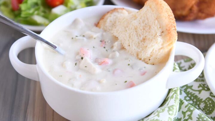 This creamy chicken soup is the perfect cold weather soup. Thick and hearty, it comes together fast and is perfect in bread bowls…or not!